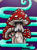 A hand painted wooden shelf block featuring a stylised depiction of Amanita Muscaria.